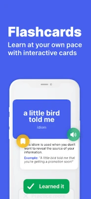 Pregătirea pentru examene prestigioase precum GRE®, IELTS®, SAT®, SSC CGL®, TOEFL®, CAT® sau AFCAT® devine mult mai accesibilă. Platforma te echipează cu peste 1.300 de idiomuri fundamentale, curatate de tutori experți. Prin funcția inovatoare „Runda Inteligentă", vei beneficia de flashcarduri personalizate, generate de un algoritm de învățare adaptiv, care prioritizează nevoile tale. Fiecare lecție este îmbunătățită cu suport audio, permițându-ți să urmărești pronunția fiecărui cuvânt și a fiecărei expresii, îmbunătățind concentrarea și reținerea.