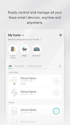Descoperiți o dimensiune nouă a confortului și controlului cu Kasa Smart. Această aplicație intuitivă, creată de TP-LINK, servește drept centrul de comandă pentru toate dispozitivele dumneavoastră inteligente din casă, transformând orice locuință într-un spațiu conectat și responsiv. Vă permite să gestionați cu ușurință întregul ecosistem smart TP-LINK, oferind o experiență de utilizare simplă și eficientă direct de pe telefon.
