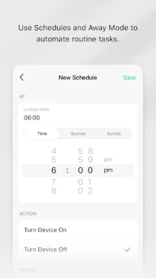 Indiferent unde vă aflați, fie acasă, la birou sau într-o călătorie, Kasa Smart vă acordă libertatea de a monitoriza și de a controla fiecare dispozitiv TP-LINK conectat. De la aprinderea lumilor la reglarea termostatului, totul este la îndemână. Personalizați-vă stilul de viață prin crearea unor programe detaliate pentru aparatele electrocasnice. Setările pot fi configurate pentru a porni sau opri automat dispozitivele la ore specifice, adaptându-se perfect rutinei dumneavoastră zilnice și contribuind la un consum energetic optimizat.