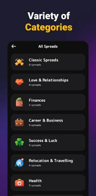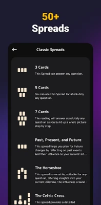 Alegeți dintr-o gamă largă de etalări de tarot, de la „Cartea Zilei" pentru intuiții rapide și „Da sau Nu" pentru decizii accelerate, până la etalări complexe precum „Trecut, Prezent, Viitor" sau „Crucea Celtică". Cu peste 50 de variante specializate și posibilitatea de a crea propriile etalări personalizate, veți găsi întotdeauna perspectiva potrivită. Pentru a vă solidifica cunoștințele, modul Quiz interactiv vă permite să vă testați și să vă îmbunătățiți înțelegerea tarotului. În plus, fiecare lectură poate fi salvată, permițându-vă să urmăriți evoluția personală și să reflectați asupra îndrumărilor primite de-a lungul timpului.