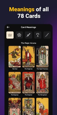 Experimentați viitorul interpretării tarotului printr-o conversație live directă cu un cititor psihic bazat pe inteligență artificială. Disponibilă oricând, această funcționalitate vă aduce răspunsuri instantanee, reprezentând o resursă neprețuită atât pentru începători, cât și pentru experți. Mai mult, aplicația conține semnificații exhaustive pentru toate cele 78 de cărți de tarot, acoperind atât pozițiile drepte, cât și pe cele inversate. De la Misterele Majore la cele Minore, veți desluși simbolismul profund și veți învăța să interpretați cărțile cu încredere pentru orice aspect al vieții.
